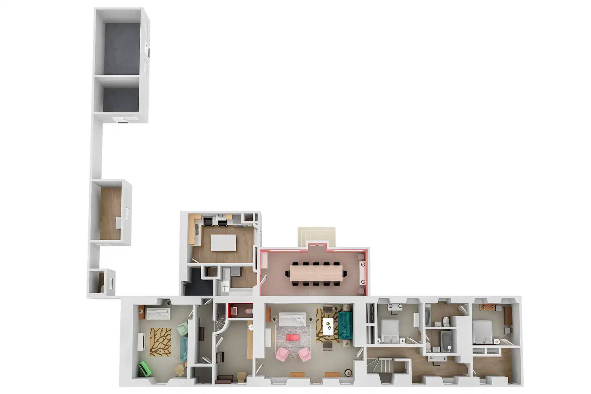 Kennels Lodge, which was completed to a detailed and beautiful standard only opened its doors to guests at the beginning of 2022. It compromises of 7 double or twin bedrooms (all but 1 is en suite, however that bedroom has its own dedicated bathroom). There is plenty of room for everyone in Kennels lodge, including a bedroom with its own external door which could afford a degree of privacy to a chef or au-pair.